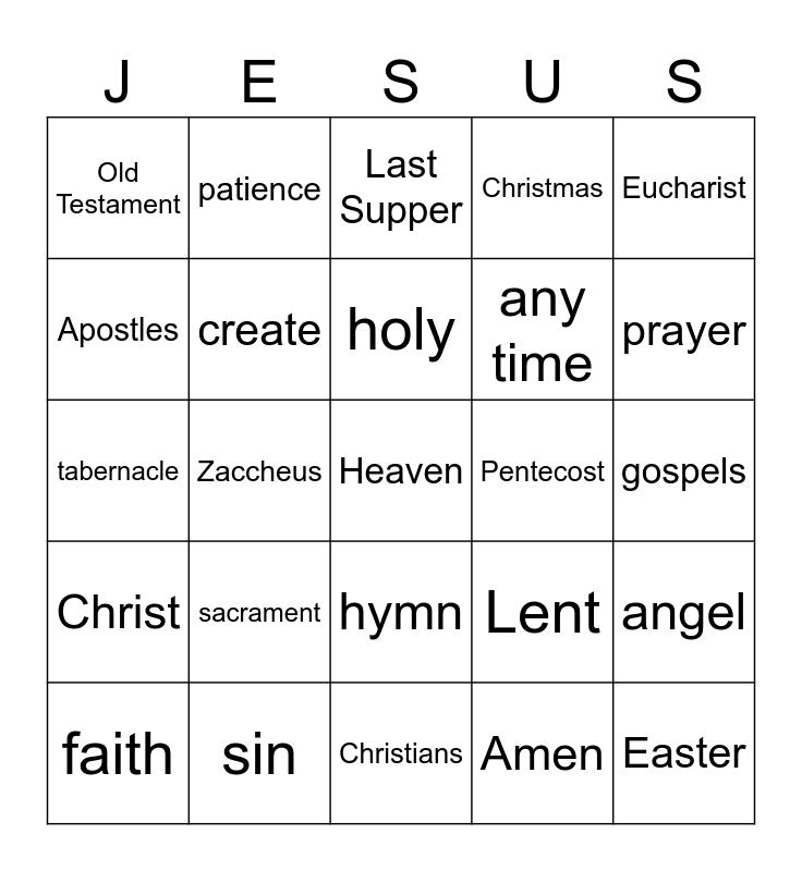 This bingo card has a free space and 34 words: Advent, Amen, Baptism, Bible, Christ, create, Eucharist, faith, patience, grace, holy, Last Supper, Mary, parish, Pentecost, prayer, sin, tabernacle, sacrament, Lent, hymn, Joseph, Old Testament, gospels, Christians, Easter, Christmas, forgive, any time, Apostles, Holy Spirit, Zaccheus, angel and God.