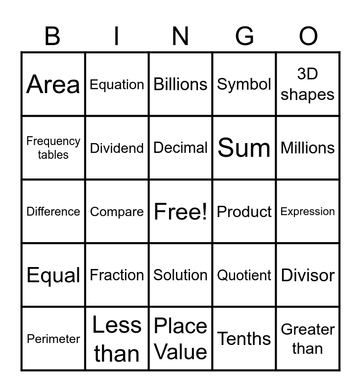 This bingo card has a free space and 25 words: Fraction, Place Value, Decimal, Perimeter, 3D shapes, Area, Frequency tables, Equation, Product, Solution, Sum, Difference, Quotient, Divisor, Dividend, Number Pattern, Expression, Billions, Millions, Compare, Greater than, Less than, Equal, Symbol and Tenths.