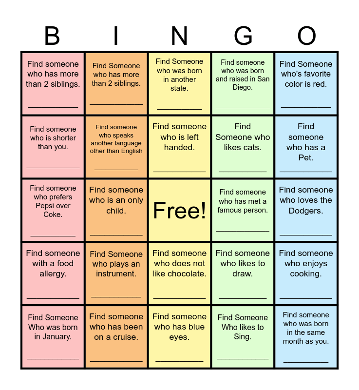 This bingo card has a free space and 25 words: Find Someone Who was born in January. ____________, Find Someone who plays an instrument. ___________, Find someone who is left handed. ___________, Find Someone Who likes to Sing. ____________, Find someone who has a Pet. ___________, Find someone who has more than 2 siblings. ___________, Find Someone who has more than 2 siblings. _____________, Find Someone who was born in another state. ___________, Find Someone who likes cats. __________, Find someone who enjoys cooking. ___________, Find someone who prefers Pepsi over Coke. ___________, Find someone who speaks another language other than English ____________, Find someone who likes to draw. __________, Find someone who was born in the same month as you. ___________, Find someone who is shorter than you. _____________, Find someone who has been on a cruise. ___________, Find someone who has blue eyes. __________, Find someone who was born and raised in San Diego. ______________, Find someone who loves the Dodgers. ___________, Find someone with a food allergy. ___________, Find someone who is an only child. ___________, Find someone who does not like chocolate. ___________, Find someone who has met a famous person. _____________, Find Someone who's favorite color is red. ___________ and Find someone who is wearing a blue shirt. ____________.