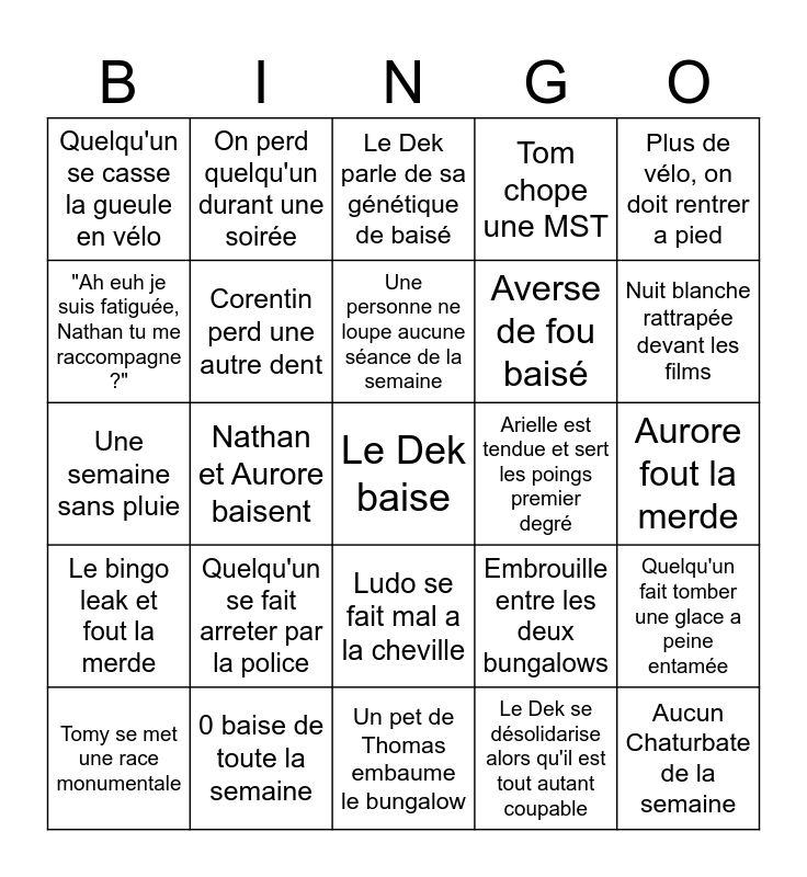 This bingo card has a free space and 24 words: Tomy se met une race monumentale, Quelqu'un se fait arreter par la police, Une personne ne loupe aucune séance de la semaine, Le Dek se désolidarise alors qu'il est tout autant coupable, Plus de vélo, on doit rentrer a pied, Quelqu'un se casse la gueule en vélo, On perd quelqu'un durant une soirée, Le Dek parle de sa génétique de baisé, Arielle est tendue et sert les poings premier degré, Aurore fout la merde, Une semaine sans pluie, Corentin perd une autre dent, Embrouille entre les deux bungalows, Quelqu'un fait tomber une glace a peine entamée, "Ah euh je suis fatiguée, Nathan tu me raccompagne ?", 0 baise de toute la semaine, Un pet de Thomas embaume le bungalow, Tom chope une MST, Nuit blanche rattrapée devant les films, Le bingo leak et fout la merde, Nathan et Aurore baisent, Ludo se fait mal a la cheville, Averse de fou baisé and Aucun Chaturbate de la semaine.