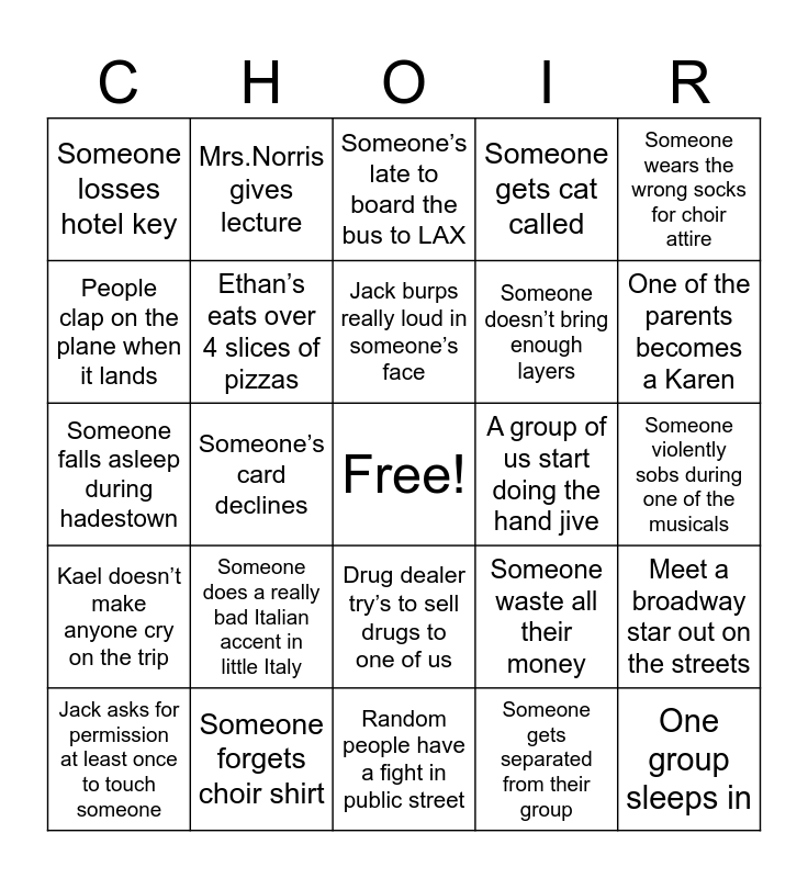 This bingo card has a free space and 24 words: Jack asks for permission at least once to touch someone, Someone does a really bad Italian accent in little Italy, Jack burps really loud in someone’s face, Someone gets separated from their group, Someone wears the wrong socks for choir attire, Someone losses hotel key, Mrs.Norris gives lecture, Someone’s late to board the bus to LAX, A group of us start doing the hand jive, Someone violently sobs during one of the musicals, Someone falls asleep during hadestown, Ethan’s eats over 4 slices of pizzas, Someone waste all their money, Meet a broadway star out on the streets, People clap on the plane when it lands, Someone forgets choir shirt, Random people have a fight in public street, Someone gets cat called, One of the parents becomes a Karen, Kael doesn’t make anyone cry on the trip, Someone’s card declines, Drug dealer try’s to sell drugs to one of us, Someone doesn’t bring enough layers and One group sleeps in.