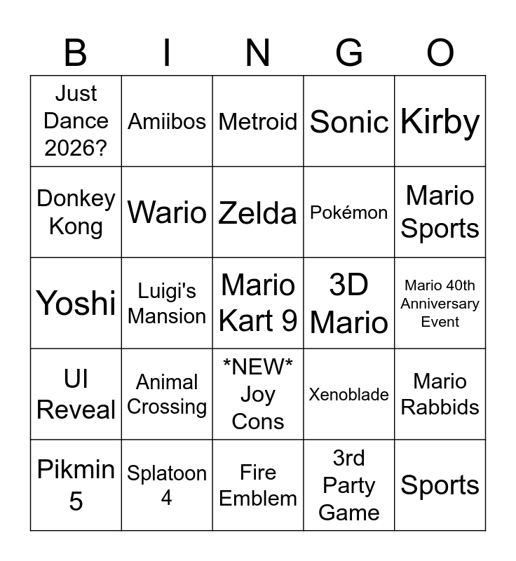This bingo card has a free space and 24 words: Animal Crossing, Splatoon 4, Zelda, Pikmin 5, Kirby, Just Dance 2026?, Donkey Kong, Amiibos, 3D Mario, *NEW* Joy Cons, Pokémon, Yoshi, Xenoblade, Mario Rabbids, Wario, 3rd Party Game, Mario 40th Anniversary Event, Metroid, Mario Sports, Luigi's Mansion, Sports, UI Reveal, Sonic and Fire Emblem.