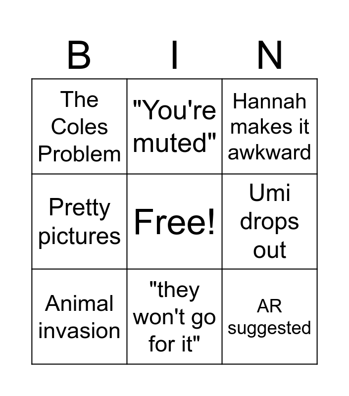 This bingo card has a free space and 23 words: "straighty 180", "utilise", "they won't go for it", VR suggested, AR suggested, The Coles Problem, Umi drops out, "You're muted", Jason gets a package, Innuendo, Chaos ensues, Laugh crying, Cartoon reference, TV reference, Movie reference, Game reference, Hannah makes it awkward, Jingles, Animal invasion, "TM Foundations sucked", Pretty pictures, AI art and Puns!.