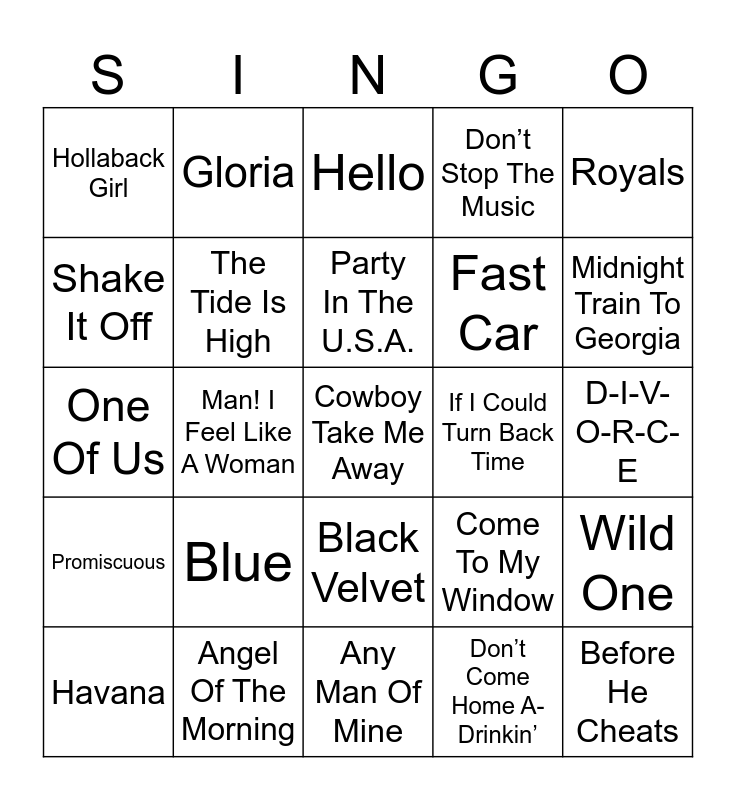 This bingo card has 72 words: I Will Survive, Gloria, Man! I Feel Like A Woman, I Will Always Love You, No One, Total Eclipse Of The Heart, Don’t Stop The Music, Baby One More Time, Fast Car, Get The Party Started, Havana, Crazy In Love, Midnight Train To Georgia, Hollaback Girl, Me And Bobby McGee, One Of Us, Come To My Window, Royals, Girls Just Want To Have Fun, D-I-V-O-R-C-E, Blue, Cowboy Take Me Away, Wild One, Downtown, Believe, One Way Or Another, Fancy, Suds In The Bucket, (You Make Me Feel Like) A Natural Woman, I Feel The Earth Move, Angel Of The Morning, Strawberry Wine, Glamorous, Heartbreaker, Don’t Come Home A-Drinkin’, Roar, We Are Family, How Do I Live, Shake It Off, Gypsies, Tramps, And Thieves, Black Velvet, Before He Cheats, Chandelier, 9 To 5, Delta Dawn, Promiscuous, Here For The Party, We Can’t Stop, Material Girl, RESPECT, Rehab, I’m Coming Out, Stuck Like Glue, If I Could Turn Back Time, You Belong With Me, I’m The Only One, Hello, Party In The U.S.A., Hips Don’t Lie, We Belong, My Church, My Guy, I Love Rock N Roll, Any Man Of Mine, Pon De Replay, Dancing Queen, The Tide Is High, Soak Up The Sun, I Say A Little Prayer, You’re No Good, Maybe It Was Memphis and Love Story.
