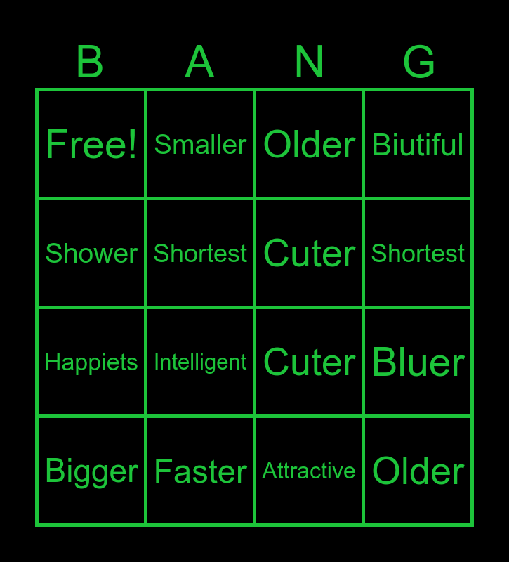 This bingo card has 16 words: Bigger, Faster, Older, Biutiful, Shower, Smaller, Cuter, Bluer, Free!, Shortest, Attractive, Shortest, Happiets, Intelligent, Cuter and Older.