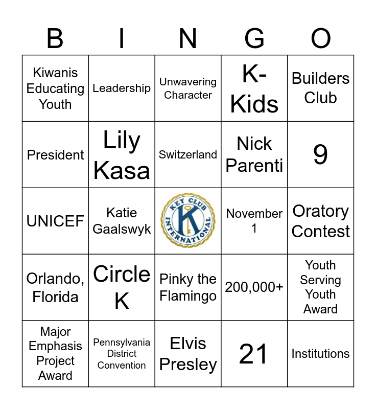 This bingo card has a free space and 40 words: Sacramento, California, UNICEF, Blue, Gold, and White, Lily Kasa, Pennsylvania District Convention, Pinky the Flamingo, Switzerland, 1987, Builders Club, Orlando, Florida, Katie Gaalswyk, K-Kids, Institutions, Oratory Contest, November 1, Circle K, Treasurer, Kiwanis Educating Youth, 0, Unwavering Character, Youth Serving Youth Award, 21, Nick Parenti, President, 6, UNICEF Champion, Kiwanis, Youth Reading Initiative, Peter Gene Hernandez, Bob Orlando, Caring—Our Way of Life, Major Emphasis Project Award, Grumble, 200,000+, 9, Elvis Presley, 1925, Atlanta, Georgia, Leadership and Pineapple.