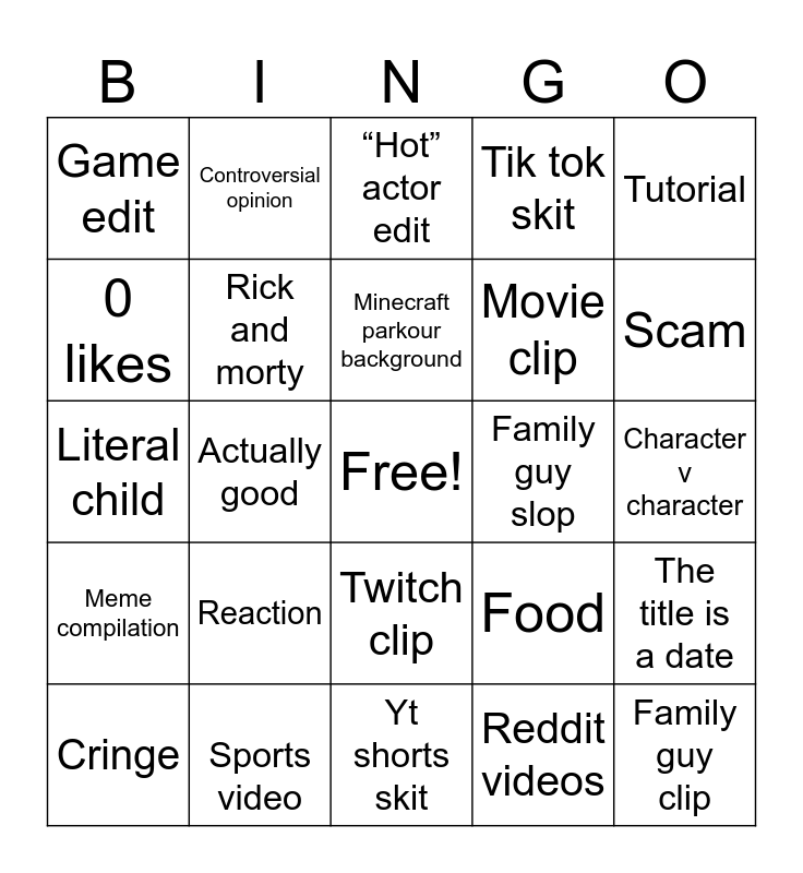 This bingo card has a free space and 24 words: Reaction, Sports video, Minecraft parkour background, Cringe, Tutorial, Game edit, 0 likes, Controversial opinion, Family guy slop, Twitch clip, Movie clip, Literal child, Food, The title is a date, Rick and morty, Reddit videos, Character v character, “Hot” actor edit, Scam, Actually good, Family guy clip, Meme compilation, Tik tok skit and Yt shorts skit.