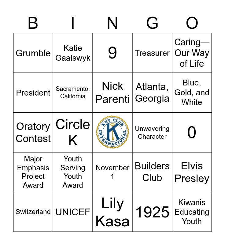 This bingo card has a free space and 40 words: Institutions, Oratory Contest, Orlando, Florida, Sacramento, California, UNICEF, November 1, Nick Parenti, Bob Orlando, Caring—Our Way of Life, Major Emphasis Project Award, Circle K, Treasurer, Kiwanis Educating Youth, 0, Unwavering Character, Youth Serving Youth Award, 21, Grumble, 200,000+, 9, Elvis Presley, 1925, Atlanta, Georgia, President, 6, UNICEF Champion, Kiwanis, Youth Reading Initiative, Peter Gene Hernandez, Leadership, Pineapple, Switzerland, 1987, Builders Club, Blue, Gold, and White, Lily Kasa, Pennsylvania District Convention, Pinky the Flamingo, Katie Gaalswyk and K-Kids.