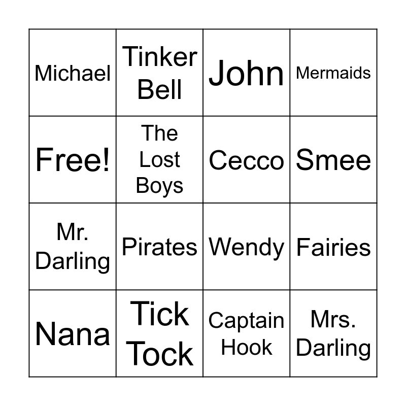 This bingo card has 16 words: Tick Tock, Fairies, John, Michael, Mr. Darling, Tinker Bell, Wendy, Captain Hook, Free!, The Lost Boys, Nana, Mermaids, Pirates, Smee, Cecco and Mrs. Darling.
