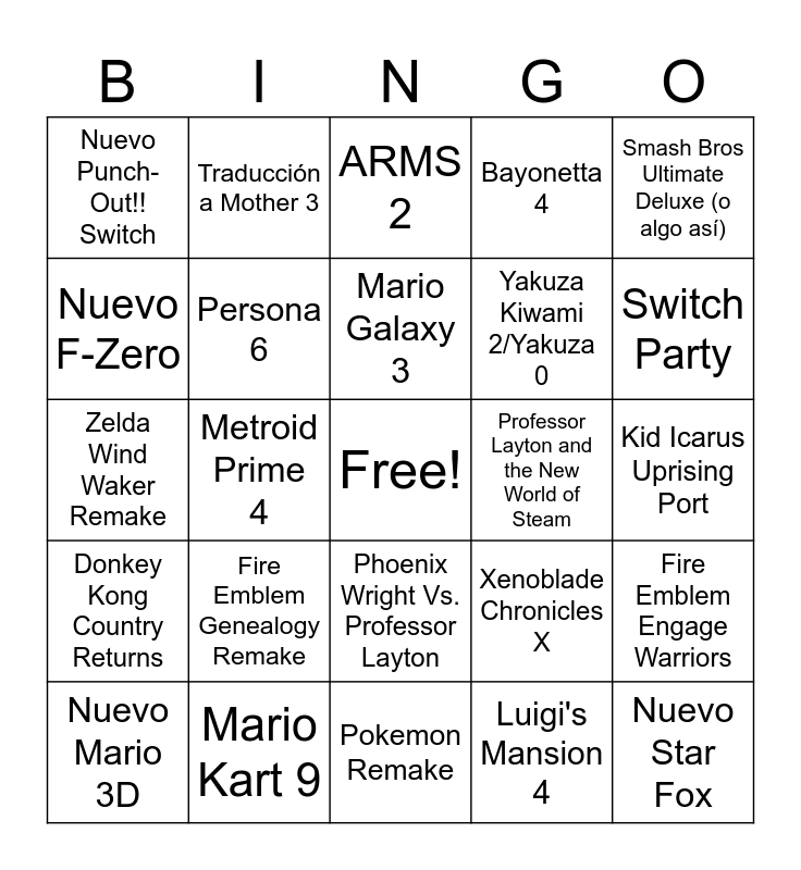This bingo card has a free space and 24 words: Fire Emblem Genealogy Remake, Mario Kart 9, Mario Galaxy 3, Nuevo Mario 3D, Smash Bros Ultimate Deluxe (o algo así), Nuevo Punch-Out!! Switch, Nuevo F-Zero, Traducción a Mother 3, Professor Layton and the New World of Steam, Phoenix Wright Vs. Professor Layton, Yakuza Kiwami 2/Yakuza 0, Zelda Wind Waker Remake, Xenoblade Chronicles X, Fire Emblem Engage Warriors, Persona 6, Luigi's Mansion 4, Kid Icarus Uprising Port, ARMS 2, Switch Party, Metroid Prime 4, Nuevo Star Fox, Donkey Kong Country Returns, Bayonetta 4 and Pokemon Remake.