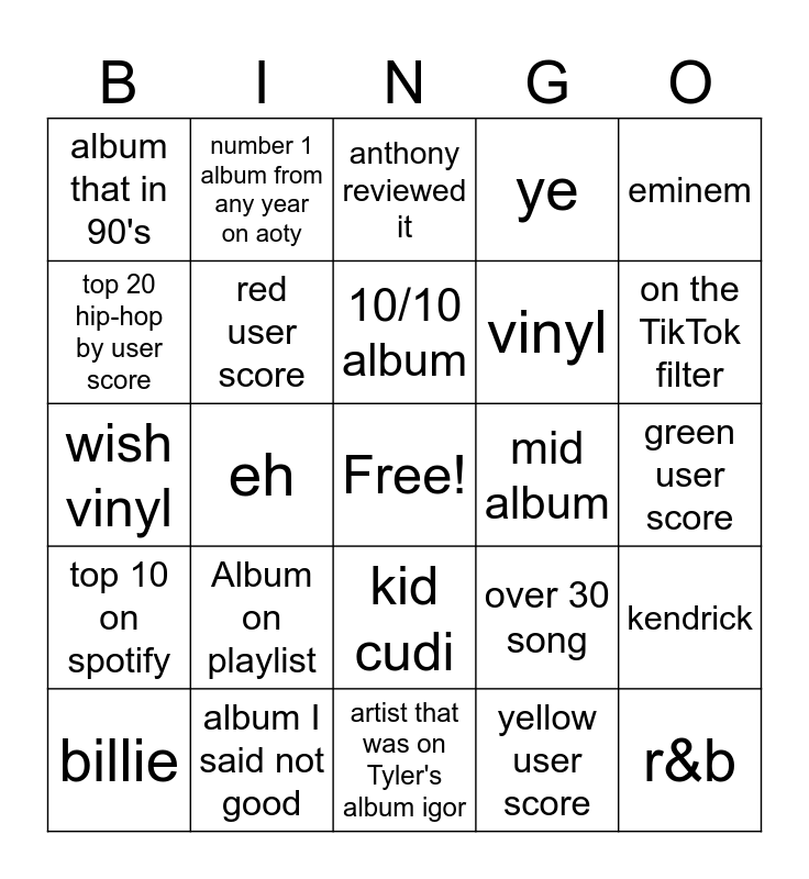 This bingo card has a free space and 24 words: Album on playlist, album I said not good, 10/10 album, billie, eminem, album that in 90's, top 20 hip-hop by user score, number 1 album from any year on aoty, mid album, kid cudi, vinyl, wish vinyl, over 30 song, kendrick, red user score, yellow user score, green user score, anthony reviewed it, on the TikTok filter, eh, r&b, top 10 on spotify, ye and artist that was on Tyler's album igor.