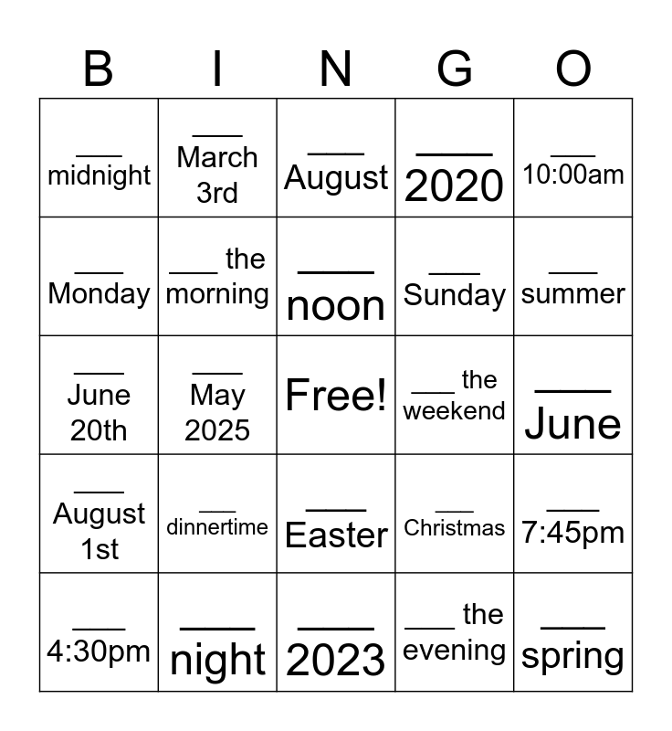 This bingo card has a free space and 24 words: ___ dinnertime, ___ night, ___ noon, ___ 4:30pm, ___ 10:00am, ___ midnight, ___ Monday, ___ March 3rd, ___ the weekend, ___ Easter, ___ Sunday, ___ June 20th, ___ Christmas, ___ 7:45pm, ___ the morning, ___ the evening, ___ June, ___ August, ___ summer, ___ May 2025, ___ spring, ___ August 1st, ___ 2020 and ___ 2023.