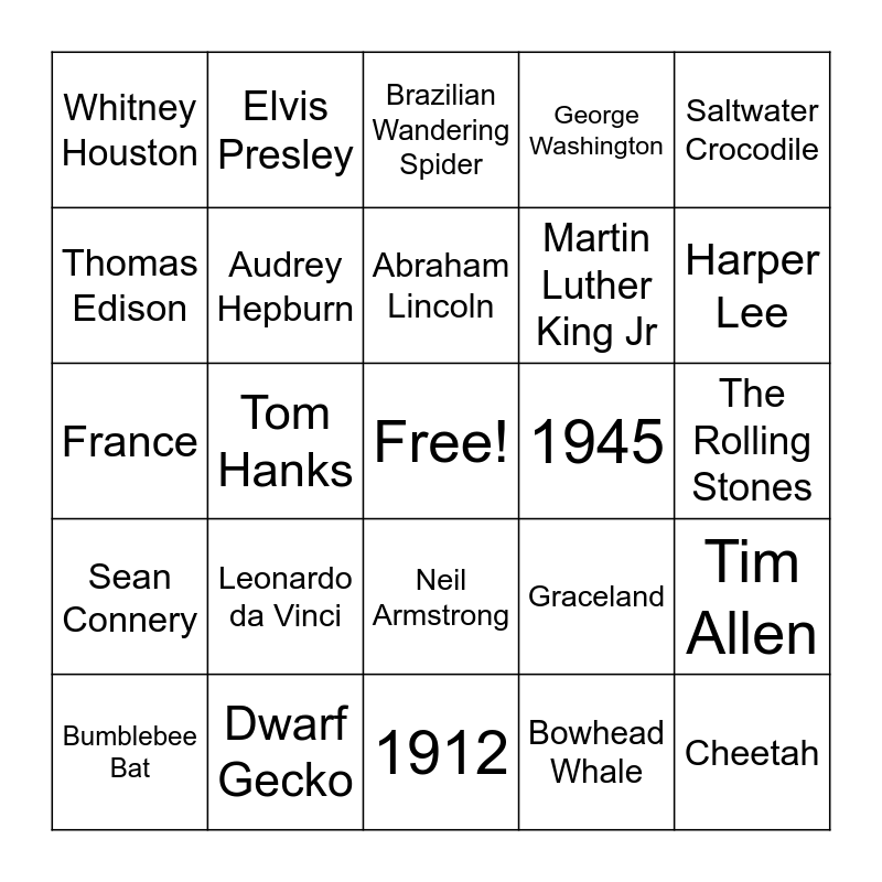 This bingo card has a free space and 45 words: Giraffe, Cheetah, Ostrich, Bumblebee Bat, Inland Taipan, Bowhead Whale, Brazilian Wandering Spider, Sailfish, Saltwater Crocodile, Dwarf Gecko, George Washington, 1945, Neil Armstrong, Leonardo da Vinci, Big Ben, 1912, Adolf Hitler, France, The Wright Flyer, Harper Lee, Elvis Presley, John Lennon, Cello, Whitney Houston, Neverland Ranch, The Rolling Stones, Knowles, Aretha Franklin, Graceland, Sean Connery, James Cameron, Tim Allen, Marlon Brando, Frank Darabont, Jodie Foster, Tom Hanks, Vivien Leigh, Steven Spielberg, Albert Einstein, Abraham Lincoln, Thomas Edison, Martin Luther King Jr, J.D. Salinger, Audrey Hepburn and Muhammad Ali.