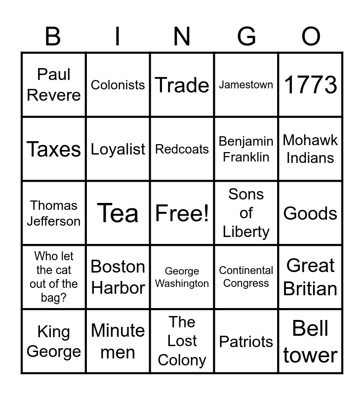 This bingo card has a free space and 24 words: Boston Harbor, Minute men, Redcoats, King George, 1773, Paul Revere, Taxes, Colonists, Sons of Liberty, George Washington, Benjamin Franklin, Thomas Jefferson, Continental Congress, Great Britian, Loyalist, Patriots, Goods, Trade, Mohawk Indians, Tea, Bell tower, Who let the cat out of the bag?, Jamestown and The Lost Colony.