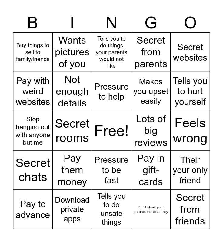 This bingo card has a free space and 39 words: Big promises, Little risks, Make money fast, Not enough details, Pay to advance, Pressure to be fast, Pressure to help, No research allowed, Secret websites, Secret chats, Secret rooms, Secret from parents, Secret from friends, Feels wrong, Lots of big reviews, Pay them money, They log into YOUR account, Buy things to sell to family/friends, Promise to keep you safe, Pay in gift-cards, Pay with weird websites, Tells you to do unsafe things, Makes you upset easily, Tells you to hurt yourself, Tells you to hurt others, Wants your school name, Wants your name, Wants your birthday, Wants your address, Wants pictures of you, Gives you compliments, Says things you know your parents would not like, Tells you to do things your parents would not like, Download private apps, Don't show your parents/friends/family, They're your only friend, Their your only friend, Stop hanging out with anyone but me and Profile name has lots of numbers.