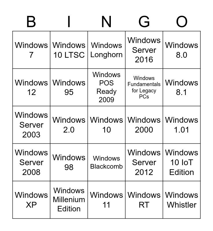 This bingo card has a free space and 29 words: Windows XP, Windows 3.11, Windows 2.0, Windows Vista, Windows 7, Windows Longhorn, Windows 95, Windows 98, Windows 2000, Windows Millenium Edition, Windows 1.01, Windows Whistler, Windows 11, Windows RT, Windows 8.1, Windows Chicago, Windows Blackcomb, Windows Server 2008, Windows 8.0, Windows Server 2003, Windows Server 2012, Windows NT 4.0, Windows Fundamentals for Legacy PCs, Windows 12, Windows Server 2016, Windows 10 LTSC, Windows 10 IoT Edition, Windows POS Ready 2009 and Windows Home Server.