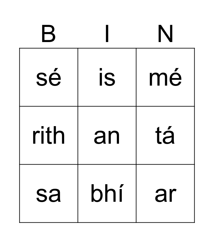This bingo card has a free space and 11 words: go, bhí, ar, sa, is, mé, tá, ag, rith, sé and sí.
