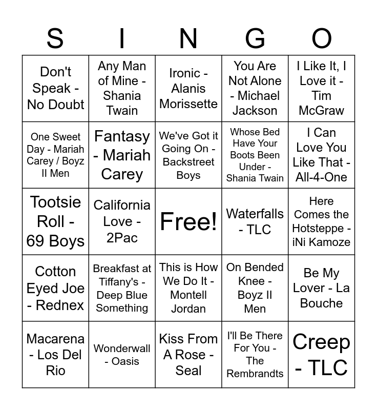 This bingo card has a free space and 30 words: Wonderwall - Oasis, You Oughta Know - Alanis Morissette, California Love - 2Pac, Gangsta's Paradise - Coolio, Don't Speak - No Doubt, Ironic - Alanis Morissette, Fantasy - Mariah Carey, This is How We Do It - Montell Jordan, Waterfalls - TLC, Kiss From A Rose - Seal, Here Comes the Hotsteppe - iNi Kamoze, Creep - TLC, I'll Be There For You - The Rembrandts, Only Wanna Be With You - Hootie & The Blowfish, I Can Love You Like That - All-4-One, As I Lay Me Down - Sophie B Hawkins, On Bended Knee - Boyz II Men, Cotton Eyed Joe - Rednex, Breakfast at Tiffany's - Deep Blue Something, I Like It, I Love it - Tim McGraw, Tootsie Roll - 69 Boys, Turn The Beat Around - Gloria Estefan, Any Man of Mine - Shania Twain, Whose Bed Have Your Boots Been Under - Shania Twain, One Sweet Day - Mariah Carey / Boyz II Men, You Are Not Alone - Michael Jackson, Be My Lover - La Bouche, Macarena - Los Del Rio, We've Got it Going On - Backstreet Boys and Just A Girl - No Doubt.