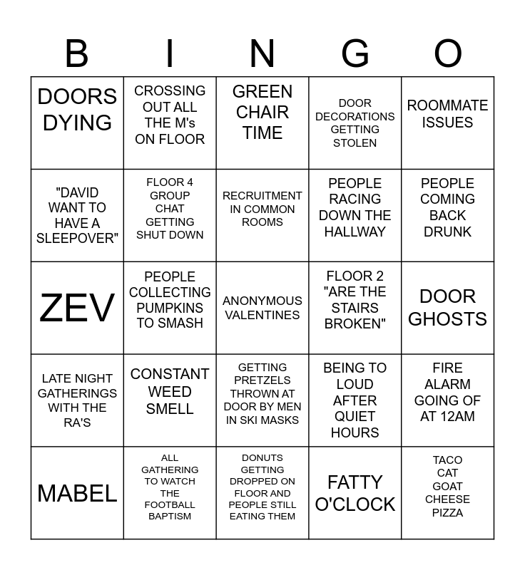 This bingo card has a free space and 24 words: CONSTANT WEED SMELL, ALL GATHERING TO WATCH THE FOOTBALL BAPTISM, RECRUITMENT IN COMMON ROOMS, MABEL, ROOMMATE ISSUES, DOORS DYING, "DAVID WANT TO HAVE A SLEEPOVER", CROSSING OUT ALL THE M's ON FLOOR, FLOOR 2 "ARE THE STAIRS BROKEN", GETTING PRETZELS THROWN AT DOOR BY MEN IN SKI MASKS, PEOPLE RACING DOWN THE HALLWAY, ZEV, BEING TO LOUD AFTER QUIET HOURS, FIRE ALARM GOING OF AT 12AM, FLOOR 4 GROUP CHAT GETTING SHUT DOWN, FATTY O'CLOCK, DOOR GHOSTS, GREEN CHAIR TIME, PEOPLE COMING BACK DRUNK, PEOPLE COLLECTING PUMPKINS TO SMASH, TACO CAT GOAT CHEESE PIZZA, LATE NIGHT GATHERINGS WITH THE RA'S, DOOR DECORATIONS GETTING STOLEN and DONUTS GETTING DROPPED ON FLOOR AND PEOPLE STILL EATING THEM.