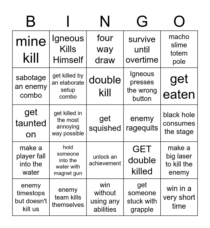 This bingo card has a free space and 24 words: hold someone into the water with magnet gun, enemy team kills themselves, double kill, enemy timestops but doesn't kill us, macho slime totem pole, mine kill, sabotage an enemy combo, Igneous Kills Himself, enemy ragequits, unlock an achievement, Igneous presses the wrong button, get taunted on, GET double killed, make a big laser to kill the enemy, get killed by an elaborate setup combo, get someone stuck with grapple, black hole consumes the stage, four way draw, get eaten, get killed in the most annoying way possible, win in a very short time, make a player fall into the water, survive until overtime and win without using any abilities.