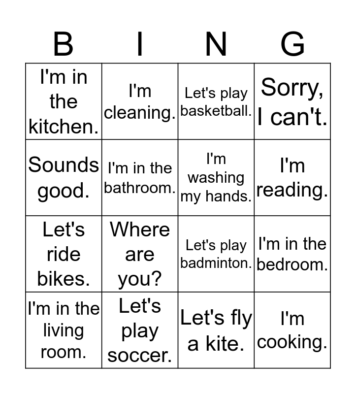 This bingo card has a free space and 18 words: Where are you?, Let's play baseball., Let's play basketball., I'm in the kitchen., I'm cooking., Sorry, I can't., I'm in the living room., I'm cleaning., I'm reading., Let's ride bikes., Let's fly a kite., Sounds good., I'm in the bedroom., I'm in the bathroom., I'm washing my hands., Let's fly a kite., Let's play soccer. and Let's go swimming..