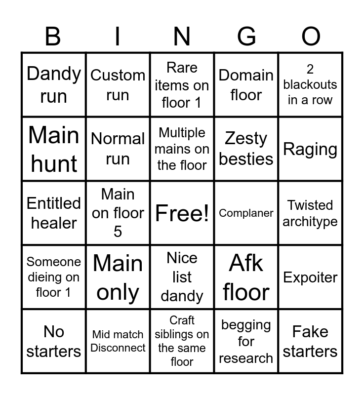 This bingo card has a free space and 24 words: No starters, Main only, Multiple mains on the floor, begging for research, 2 blackouts in a row, Dandy run, Custom run, Rare items on floor 1, Complaner, Twisted architype, Entitled healer, Normal run, Afk floor, Expoiter, Main hunt, Mid match Disconnect, Craft siblings on the same floor, Domain floor, Raging, Someone dieing on floor 1, Main on floor 5, Nice list dandy, Zesty besties and Fake starters.