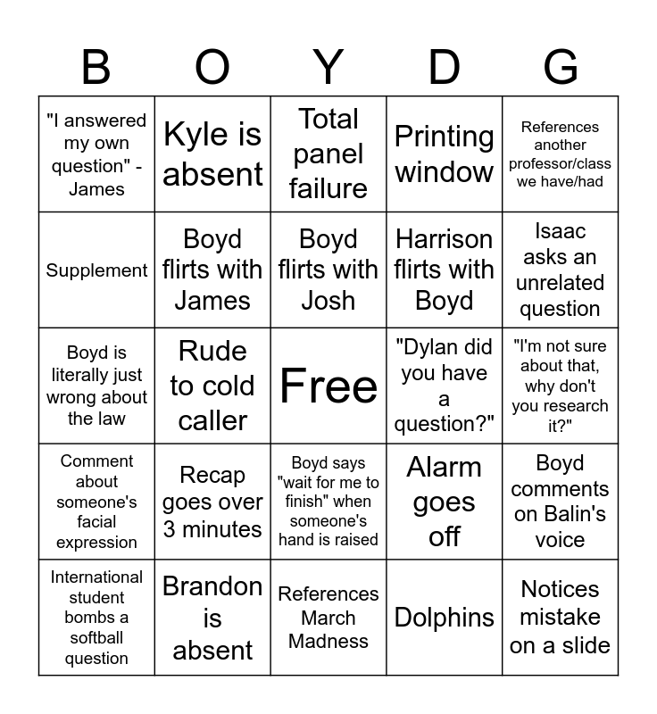 This bingo card has a free space and 24 words: Recap goes over 3 minutes, Brandon is absent, Boyd flirts with Josh, International student bombs a softball question, References another professor/class we have/had, "I answered my own question" - James, Supplement, Kyle is absent, "Dylan did you have a question?", Boyd says "wait for me to finish" when someone's hand is raised, Harrison flirts with Boyd, Boyd is literally just wrong about the law, Alarm goes off, Boyd comments on Balin's voice, Boyd flirts with James, Dolphins, "I'm not sure about that, why don't you research it?", Total panel failure, Isaac asks an unrelated question, Rude to cold caller, Notices mistake on a slide, Comment about someone's facial expression, Printing window and References March Madness.