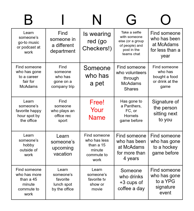 This bingo card has a free space and 34 words: Find someone who can say the 4 McAdams values, Someone who drinks +3 cups of coffee a day, Someone who keeps a plant at their desk, Find someone from North Carolina, Learn someone’s hobby outside of work, Find someone who has gone on a company trip, Find someone who has been at McAdams for less than a year, Find someone who has more than a 45 minute commute to work, Find someone in a different department, Find someone who has not gone to a hockey game before, Someone who has a pet, Is wearing red (go Checkers!), Find someone in a different department, Find someone in a different department, Has gone to a Panthers, FC, or Hornets game before, Find someone who has bought a food or drink at the game, Learn someone’s favorite lunch spot by the office, Learn someone’s favorite happy hour spot by the office, Learn someone’s upcoming vacation, Find someone who has been at McAdams for more than 4 years, Find someone who has less than a 15 minute commute to work, Learn someone’s favorite snack at work, Learn someone’s go-to music or podcast at work, Signature of the person sitting next to you, Learn someone’s favorite tv show or movie, Find someone who has gone to a YPG signature event, Take a selfie with someone else (or a group of people) and post in the teams chat, Find someone who is a part of a professional organization, Find someone who volunteers through McAdams Shares, Find someone who has gone to a career fair for McAdams, Find someone not from North Carolina, Find someone who plays an office rec sport, Find someone who has gone to a hockey game before and Find someone going to the upcoming Founder’s Day.