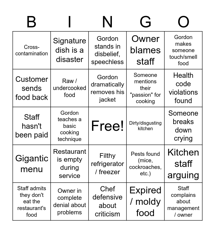 This bingo card has a free space and 34 words: Gordon spits out food, Expired / moldy food, "Fresh frozen", Microwaved food, Gigantic menu, Raw / undercooked food, Gordon makes someone touch/smell food, Staff admits they don't eat the restaurant's food, Signature dish is a disaster, "SHUT IT DOWN!", Gordon dramatically removes his jacket, Gordon stands in disbelief, speechless, Gordon compliments the decor sarcastically, Gordon dramatically throws food in the trash, Dirty/disgusting kitchen, Health code violations found, Owner in complete denial about problems, Staff hasn't been paid, Restaurant is empty during service, Pests found (mice, cockroaches, etc.), Filthy refrigerator / freezer, Massive debt revealed, Cross-contamination, Someone breaks down crying, Chef defensive about criticism, Staff complains about management / owner, Owner blames staff, Dramatic walk-out (staff or Gordon), Someone mentions their "passion" for cooking, Customer sends food back, Gordon simplifies the menu, Gordon teaches a basic cooking technique, Kitchen staff arguing and Overpriced menu items.