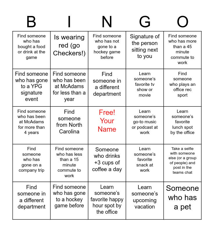 This bingo card has a free space and 33 words: Find someone who is a part of a professional organization, Find someone who volunteers through McAdams Shares, Find someone from North Carolina, Learn someone’s hobby outside of work, Find someone who has gone on a company trip, Find someone who has been at McAdams for less than a year, Find someone who has more than a 45 minute commute to work, Find someone in a different department, Is wearing red (go Checkers!), Find someone in a different department, Find someone in a different department, Find someone who has not gone to a hockey game before, Find someone who has gone to a career fair for McAdams, Find someone who can say the 4 McAdams values, Learn someone’s go-to music or podcast at work, Find someone who plays an office rec sport, Find someone who has gone to a hockey game before, Find someone who has been at McAdams for more than 4 years, Find someone who has less than a 15 minute commute to work, Learn someone’s favorite snack at work, Someone who drinks +3 cups of coffee a day, Someone who keeps a plant at their desk, Find someone who has bought a food or drink at the game, Learn someone’s favorite lunch spot by the office, Learn someone’s favorite happy hour spot by the office, Someone who has a pet, Signature of the person sitting next to you, Learn someone’s favorite tv show or movie, Find someone who has gone to a YPG signature event, Take a selfie with someone else (or a group of people) and post in the teams chat, Has gone to a Panthers, FC, or Hornets game before, Learn someone’s upcoming vacation and Find someone going to the upcoming Founder’s Day.