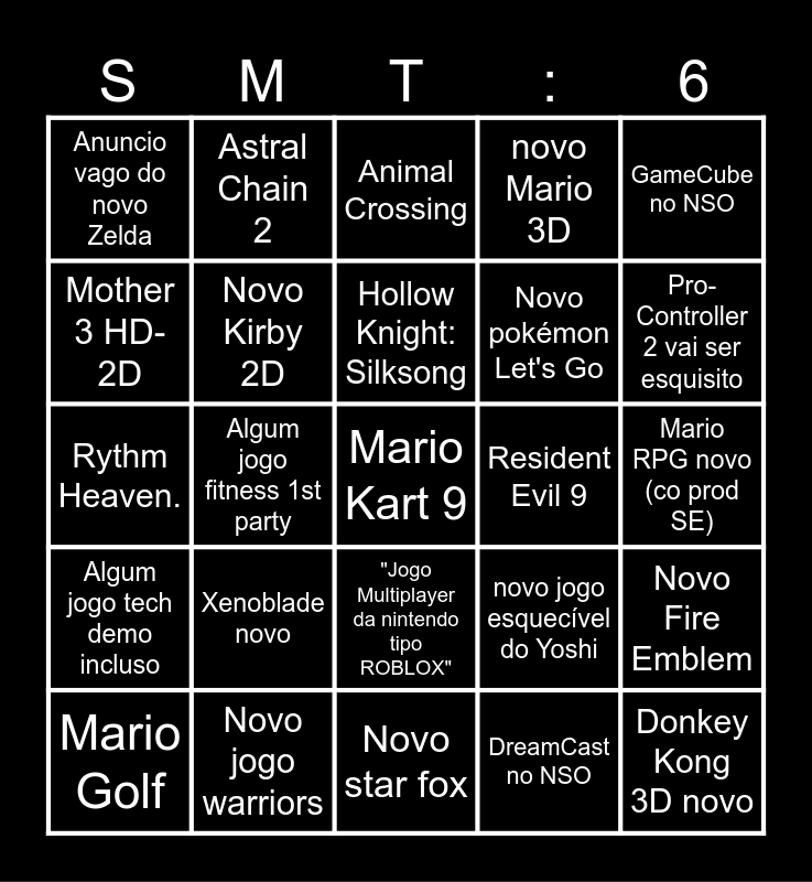 This bingo card has a free space and 24 words: Xenoblade novo, Novo jogo warriors, Hollow Knight: Silksong, Mario Golf, GameCube no NSO, Anuncio vago do novo Zelda, Mother 3 HD-2D, Astral Chain 2, Resident Evil 9, "Jogo Multiplayer da nintendo tipo ROBLOX", Novo pokémon Let's Go, Rythm Heaven., novo jogo esquecível do Yoshi, Novo Fire Emblem, Novo Kirby 2D, DreamCast no NSO, Mario RPG novo (co prod SE), Animal Crossing, Pro-Controller 2 vai ser esquisito, Algum jogo fitness 1st party, Donkey Kong 3D novo, Algum jogo tech demo incluso, novo Mario 3D and Novo star fox.