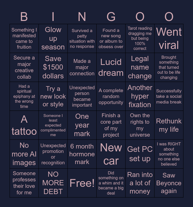 This bingo card has 40 words: Free!, Legal name change, Raise, Secure a major creative collab, Finish a core part of my project, Successfully take a social media break, Save $1500 dollars, Angel numbers yell at me several times a day, Tarot reading dragging me but being 100% correct, A complete random opportunity, Brought something that turned out to be life changing, Found a new song or album to obsess over, Had a spiritual epiphany at the wrong time, Unexpected person became important, Try a new look or style, Another hyper fixation, I was RIGHT about something no one else believed, Something I manifested came to fruition, Did something on a whim and it became a big deal, Survived a petty situation with no response, Someone I least expected complimented me, Rethunk my life, Made a major connection, Went viral, Ran into a lot of money, New car, Unexpected promotion or recognition, Saw Beyonce again, No more AI images, 6 month hormone mark, 9 month hormone mark, One year mark, Someone professes their love for me, A tattoo, Lucid dream, Own the rights to my universe, Get PC set up, NO MORE DEBT, Glow up season and Finish my sanctuary.