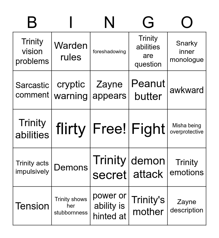 This bingo card has a free space and 24 words: Demons, Trinity shows her stubbornness, Zayne appears, Tension, Snarky inner monologue, Trinity vision problems, Sarcastic comment, Warden rules, Fight, Trinity secret, Peanut butter, Trinity abilities, demon attack, Trinity emotions, cryptic warning, Trinity's mother, Misha being overprotective, foreshadowing, awkward, flirty, Zayne description, Trinity acts impulsively, Trinity abilities are question and power or ability is hinted at.