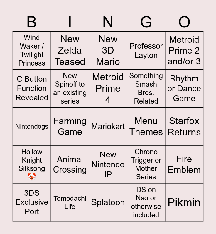 This bingo card has a free space and 24 words: Animal Crossing, Tomodachi Life, Metroid Prime 4, 3DS Exclusive Port, Metroid Prime 2 and/or 3, Wind Waker / Twilight Princess, C Button Function Revealed, New Zelda Teased, Menu Themes, New Nintendo IP, Something Smash Bros. Related, Nintendogs, Chrono Trigger or Mother Series, Fire Emblem, New Spinoff to an existing series, DS on Nso or otherwise included, Starfox Returns, New 3D Mario, Rhythm or Dance Game, Farming Game, Pikmin, Hollow Knight Silksong 🤡, Professor Layton and Splatoon.