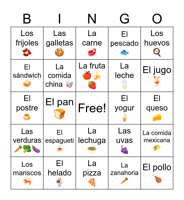 This bingo card has a free space and 38 words: El agua ๐ง, La bebida ๐ฅค, El cereal ๐ฅฃ, La comida china ๐ฅก, La comida mexicana ๐ฎ, El espagueti ๐, La fruta ๐๐๐, La hamburguesa ๐, Los huevos ๐ณ, La leche ๐ฅ, El pan ๐, El pescado ๐, El pollo ๐, El queso ๐ง, El sรกndwich ๐ฅช, Las verduras ๐ฅ๐ฅฆ๐, El arroz ๐, La carne ๐ฅฉ, La comida italiana ๐, El yogur ๐ฆ, Los frijoles ๐ซ, El helado ๐จ, El jugo ๐น, Los mariscos ๐ฆ, El pavo ๐ฆ, La pizza ๐, El cerdo ๐, Los refrescos ๐ฅค, Las fresas ๐, El plรกtano ๐, Las espinacas ๐ฅฌ, La lechuga ๐ฅ, La zanahoria ๐ฅ, Las galletas ๐ช, El pastel ๐, Las uvas ๐, El postre ๐ฎ and El flan ๐ฎ.