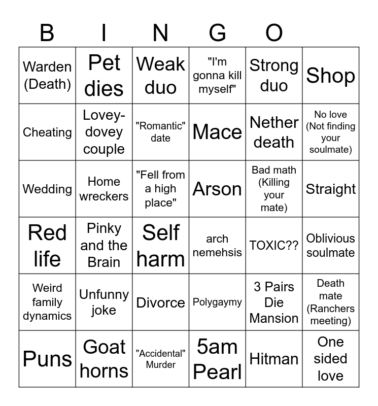 This bingo card has 36 words: Polygaymy, Divorce, 5am Pearl, Cheating, Red life, Arson, Lovey-dovey couple, "Accidental" Murder, Strong duo, 3 Pairs Die Mansion, No love (Not finding your soulmate), "I'm gonna kill myself", Death mate (Ranchers meeting), Home wreckers, Mace, Warden (Death), Weird family dynamics, Bad math (Killing your mate), Wedding, Weak duo, "Fell from a high place", Pinky and the Brain, arch nemehsis, Self harm, TOXIC??, Pet dies, Nether death, Goat horns, "Romantic" date, Shop, One sided love, Puns, Oblivious soulmate, Straight, Unfunny joke and Hitman.