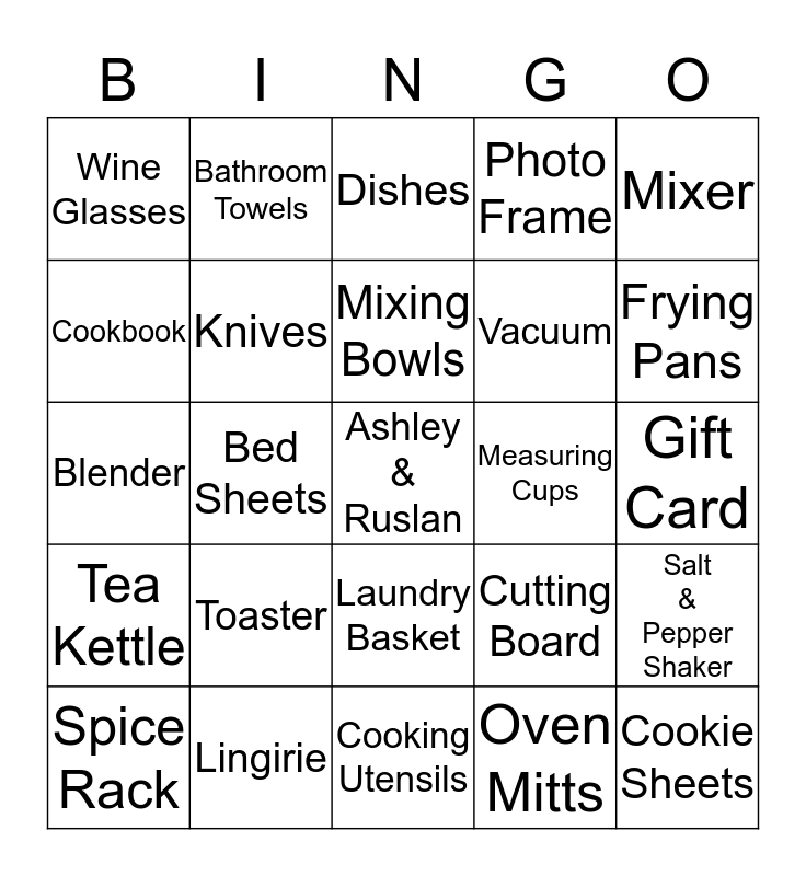 This bingo card has a free space and 24 words: Toaster, Lingirie, Mixing Bowls, Spice Rack, Mixer, Wine Glasses, Cookbook, Bathroom Towels, Measuring Cups, Laundry Basket, Vacuum, Blender, Cutting Board, Salt & Pepper Shaker, Knives, Oven Mitts, Gift Card, Dishes, Frying Pans, Bed Sheets, Cookie Sheets, Tea Kettle, Photo Frame and Cooking Utensils.