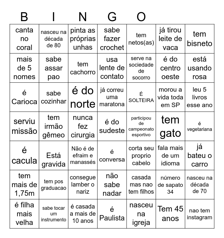 This bingo card has 70 words: morou fora do país, é Carioca, tem 3 ou mais filhos, fala mais de um idioma, serviu missão, serve na ORM, sabe fazer crochet, é filha mais velha, tem netos(as), serve na primária, morou a vida toda em SP, é Paulista, canta no coral, pinta as próprias unhas, tem o seu próprio negócio, serve na sociedade de socorro, já correu uma maratona, sabe assar pao, sabe tocar um instrumento, sabe cozinhar, está usando rosa, É SOLTEIRA, tem cachorro, tem gato, Está gravida, casada mas nao tem filhos, tem pos graduacao, não sabe nadar, nunca fez cirurgia, nasceu na década de 70, nasceu na década de 80, é casada a mais de 10 anos, é casada a menos de 10 anos, sabe costurar, corta seu proprio cabelo, é conversa, nasceu na igreja, Toca piano, é cacula, já tirou leite de vaca, é do sudeste, é do norte, é do centro oeste, nasceu fora do brasil, nunca pintou o cabelo, tem bisneto, leu 5 livros esse ano, já bateu o carro, Casou em 3 meses, tem mais de 1,75m, número de sapato 34, faz aniversário no mesmo mês que voce, é vegetariana, Não é de efraim e manassés, tem irmão gêmeo, nasceu na década de 90, mais de 5 nomes, já viu alguém famoso, já ficou presa no elevador, participou de campeonato esportivo, usa lente de contato, já usou aparelho de dente, gosta de matemática, consegue lamber o nariz, Tem 45 anos, já quebrou um osso, é canhoto, nao tem instagram, já serviu missão and acorda antes das 6am.