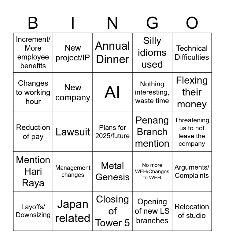 This bingo card has a free space and 25 words: Layoffs/ Downsizing, Management changes, AI, Opening of new LS branches, Flexing their money, Increment/ More employee benefits, New project/IP, Annual Dinner, Nothing interesting, waste time, Arguments/ Complaints, Reduction of pay, New company, No more WFH/Changes to WFH, Relocation of studio, Changes to working hour, Japan related, Closing of Tower 5, Silly idioms used, Threatening us to not leave the company, Mention Hari Raya, Lawsuit, Metal Genesis, Penang Branch mention, Technical Difficulties and No more free food.