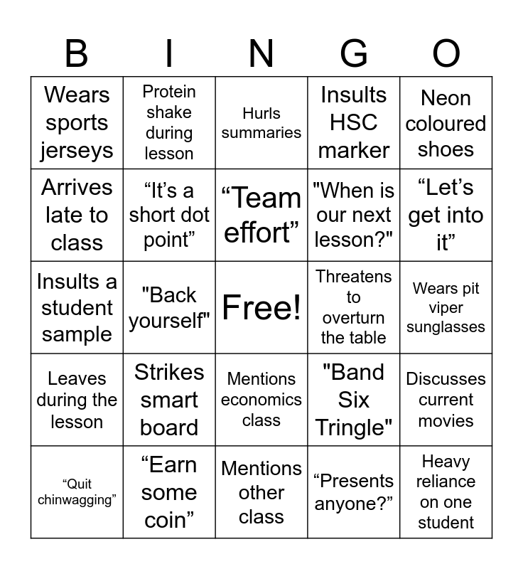 This bingo card has a free space and 27 words: "Band Six Tringle", "You don't need this", "When is our next lesson?", Mentions other class, Arrives late to class, Hurls summaries, Protein shake during lesson, Leaves during the lesson, Threatens to overturn the table, Discusses current movies, Insults a student sample, Insults HSC marker, “Quit chinwagging”, “Earn some coin”, “Let’s get into it”, Money Slander, “It’s a short dot point”, “Team effort”, Strikes smart board, Wears sports jerseys, Wears pit viper sunglasses, “Presents anyone?”, "Back yourself", Heavy reliance on one student, Mentions economics class, Neon coloured shoes and Mentions Apple or Qantas.