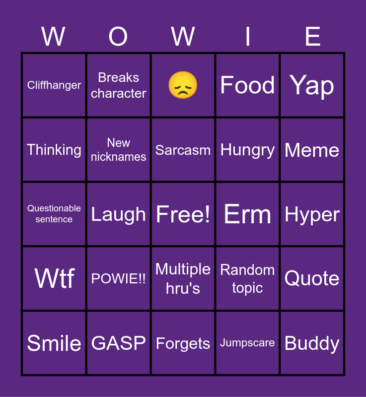 This bingo card has a free space and 26 words: Multiple hru's, Jumpscare, Sarcasm, GASP, Yap, Cliffhanger, Thinking, Breaks character, Hyper, Random topic, Hungry, Questionable sentence, Quote, Smile, Laugh, GUYS, Food, Wtf, 😞, Buddy, Meme, Forgets, Erm, POWIE!!, New nicknames and Cut off joke.