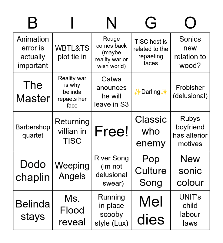 This bingo card has a free space and 24 words: Weeping Angels, Ms. Flood reveal, Gatwa anounces he will leave in S3, Belinda stays, Sonics new relation to wood?, Animation error is actually important, The Master, WBTL&TS plot tie in, Classic who enemy, River Song (im not delusional i swear), ✨Darling✨, Barbershop quartet, Pop Culture Song, New sonic colour, Reality war is why belinda repaets her face, Mel dies, Rubys boyfriend has alterior motives, Rouge comes back (maybe reality war or wish world), Frobisher (delusional), Returning villian in TISC, UNIT's child labour laws, Dodo chaplin, TISC host is related to the repaeting faces and Running in place scooby style (Lux).