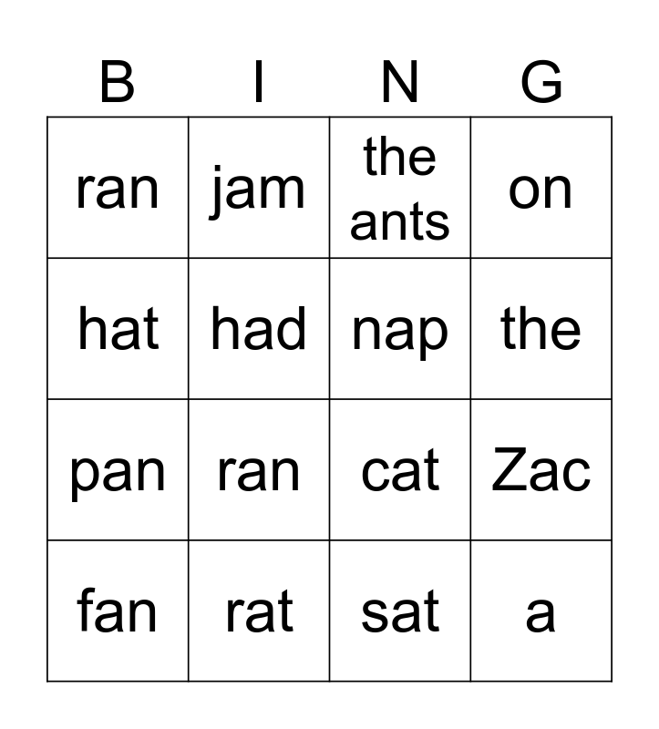 This bingo card has 16 words: rat, Zac, the ants, ran, pan, jam, cat, sat, hat, had, fan, on, ran, the, nap and a.