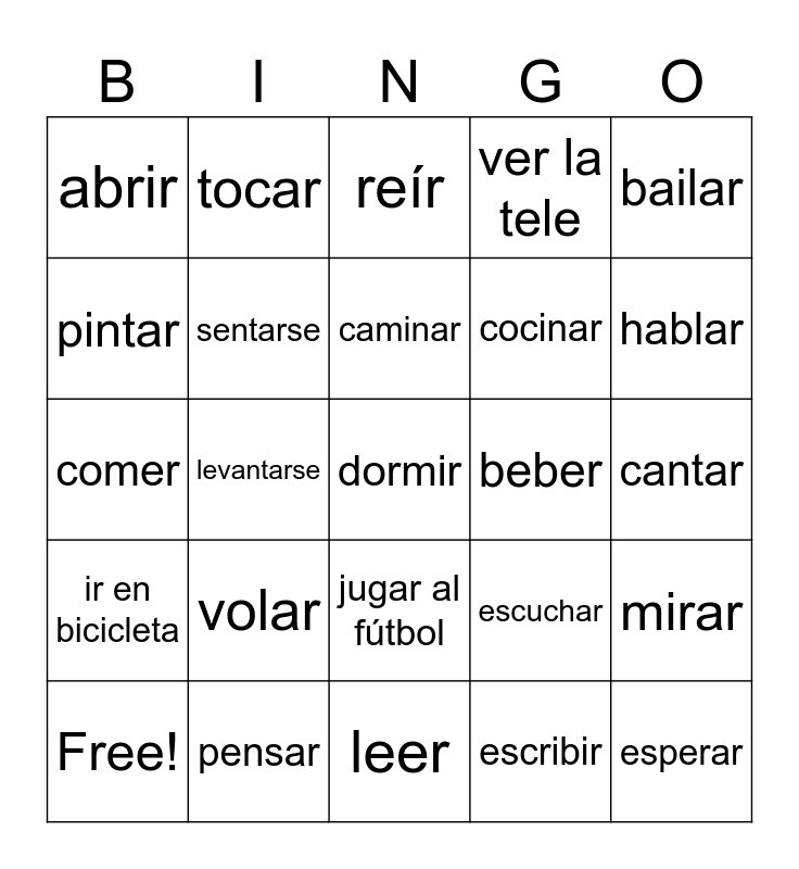 This bingo card has 29 words: Free!, despertarse, levantarse, esperar, abrir, reír, sentarse, volar, beber, pensar, cantar, dormir, leer, escribir, hablar, esquiar, jugar al fútbol, ir en bicicleta, bailar, comer, escuchar, nadar, cocinar, pintar, ver la tele, tocar, mirar, caminar and sonar.