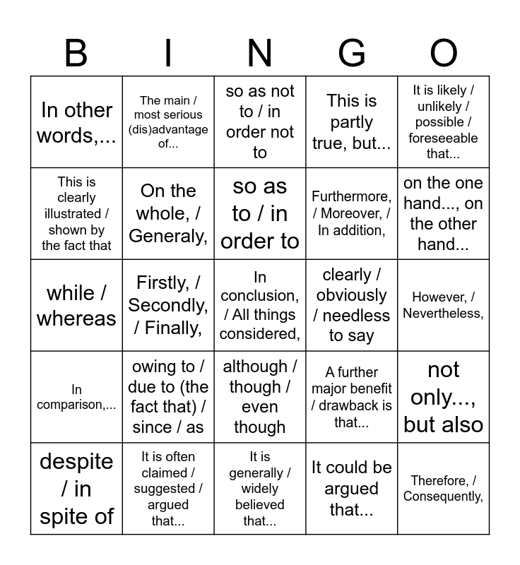 This bingo card has a free space and 24 words: owing to / due to (the fact that) / since / as, It is often claimed / suggested / argued that..., so as to / in order to, despite / in spite of, It is likely / unlikely / possible / foreseeable that..., In other words,..., This is clearly illustrated / shown by the fact that, The main / most serious (dis)advantage of..., clearly / obviously / needless to say, although / though / even though, Furthermore, / Moreover, / In addition,, while / whereas, A further major benefit / drawback is that..., not only..., but also, On the whole, / Generaly,, It could be argued that..., However, / Nevertheless,, so as not to / in order not to, on the one hand..., on the other hand..., Firstly, / Secondly, / Finally,, Therefore, / Consequently,, In comparison,..., This is partly true, but... and It is generally / widely believed that....