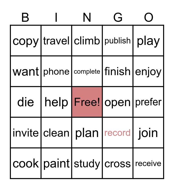 This bingo card has a free space and 24 words: clean, paint, complete, cook, play, copy, want, travel, open, plan, finish, die, record, join, phone, cross, prefer, climb, enjoy, help, receive, invite, publish and study.