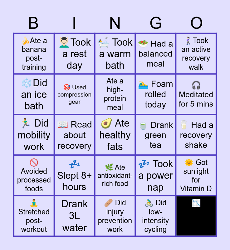 This bingo card has a free space and 24 words: π€ Slept 8+ hours, Drank 3L water, Ate a high-protein meal, π§ββοΈ Stretched post-workout, πΆπ»ββοΈTook an active recovery walk, πAte a banana post-training, βοΈDid an ice bath, ππ»ββοΈTook a rest day, π΅ Drank green tea, πΏ Ate antioxidant-rich food, πββοΈ Foam rolled today, πββοΈ Did mobility work, π€ Took a power nap, π Got sunlight for Vitamin D, π― Used compression gear, π΄ββοΈ Did low-intensity cycling, π₯ Had a recovery shake, π Took a warm bath, π§ Meditated for 5 mins, π Read about recovery, π Measured hydration levels, π« Avoided processed foods, π₯ Had a balanced meal and π©Ή Did injury prevention work.