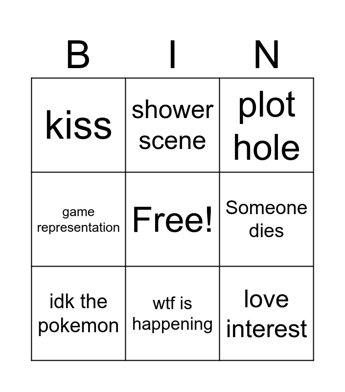 This bingo card has a free space and 8 words: Someone dies, plot hole, shower scene, idk the pokemon, kiss, love interest, game representation and wtf is happening.