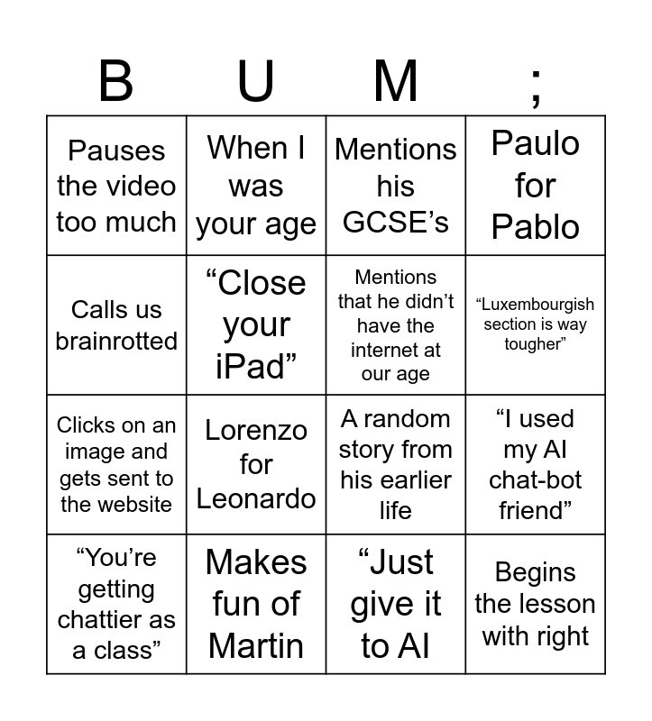 This bingo card has 16 words: Makes fun of Martin, “I used my AI chat-bot friend”, Mentions his GCSE’s, Pauses the video too much, Clicks on an image and gets sent to the website, When I was your age, A random story from his earlier life, “Just give it to AI, Calls us brainrotted, “Close your iPad”, “You’re getting chattier as a class”, Paulo for Pablo, Lorenzo for Leonardo, “Luxembourgish section is way tougher”, Mentions that he didn’t have the internet at our age and Begins the lesson with right.