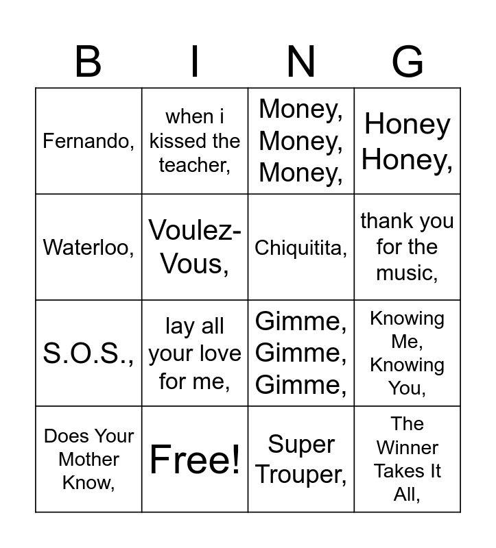 This bingo card has 16 words: Free!, Knowing Me, Knowing You,, Money, Money, Money,, Fernando,, S.O.S.,, when i kissed the teacher,, Gimme, Gimme, Gimme,, Super Trouper,, Waterloo,, Voulez-Vous,, Does Your Mother Know,, Honey Honey,, lay all your love for me,, thank you for the music,, Chiquitita, and The Winner Takes It All,.